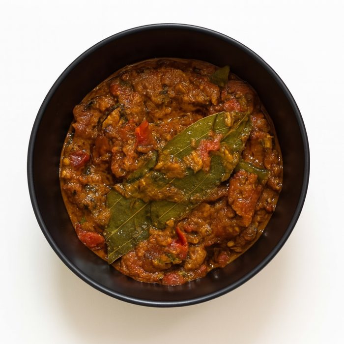 Oil, Tomatoes, Ginger, Turmeric, whole and ground spices, Fenugreek leaves and Fresh Coriander leaves.